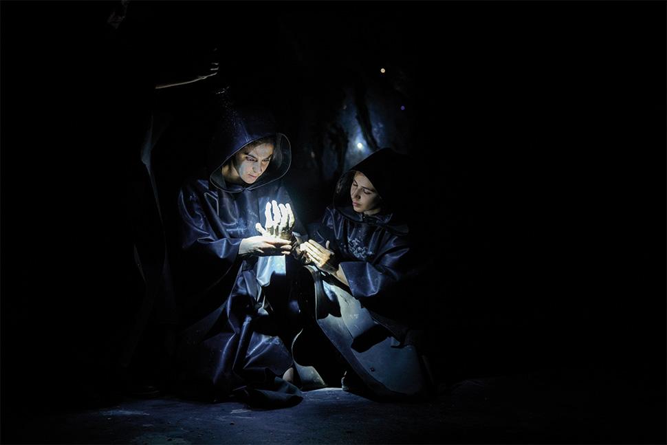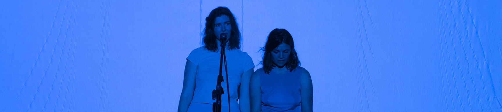 Due donne interagiscono l’una con l’altra e con una serie di video proiettati alle loro spalle.
