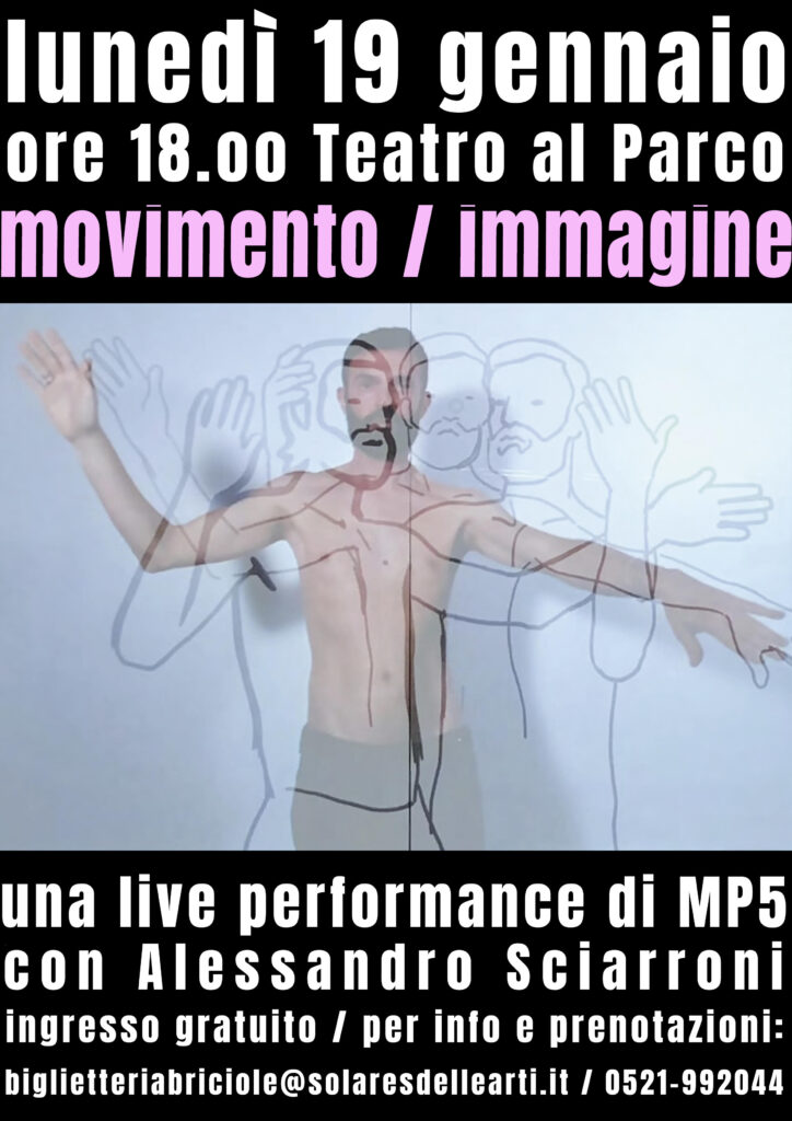La performance si inserisce nel dialogo tra arti visive e performative che ha caratterizzato il progetto espositivo: sul palco del Teatro al Parco di Parma, durante l’intervento coreografico dal vivo di Alessandro Sciarroni, artista italiano attivo nelle performing arts e Leone d’Oro alla carriera per la Danza nel 2019, MP5 realizzerà un’azione di disegno dal vivo, traducendo il movimento in immagine e rendendo visibile, nel suo farsi, il processo creativo.